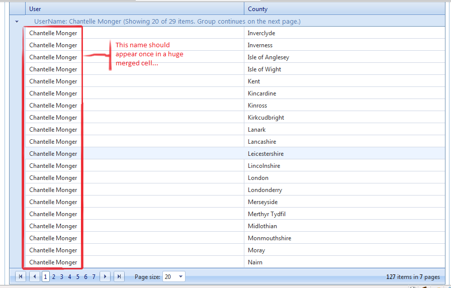 <fieldset id="fieldsetCountyAssignments" style="width: 868px"> <legend> County Assignments: </legend> <telerik:RadGrid ID="RadGridCountyAssignments2" runat="server" AutoGenerateColumns="False" AllowPaging="True" GridLines="None" Skin="Office2007" SkinID="RadGrid_UnPageable" DataSourceID="LinqDataSourceAssignedCounties" ShowGroupPanel="True"> <MasterTableView DataKeyNames="OID" DataSourceID="LinqDataSourceAssignedCounties" GroupsDefaultExpanded="true"> <Columns> <telerik:GridBoundColumn DataField="UserName" HeaderText="User" UniqueName="columnUserName" /> <telerik:GridBoundColumn DataField="CountyName" HeaderText="County" UniqueName="columnCountyName" Groupable="False" /> </Columns> <GroupByExpressions> <telerik:GridGroupByExpression> <SelectFields> <telerik:GridGroupByField FieldName="UserName" /> </SelectFields> <GroupByFields> <telerik:GridGroupByField FieldName="UserName" /> </GroupByFields> </telerik:GridGroupByExpression> </GroupByExpressions> </MasterTableView> <ClientSettings AllowDragToGroup="True"> </ClientSettings> </telerik:RadGrid> <asp:Button ID="ButtonModifyAssignments" runat="server" OnClick="ButtonModifyAssignments_Click" Text="Modify Assignments" /> </fieldset>