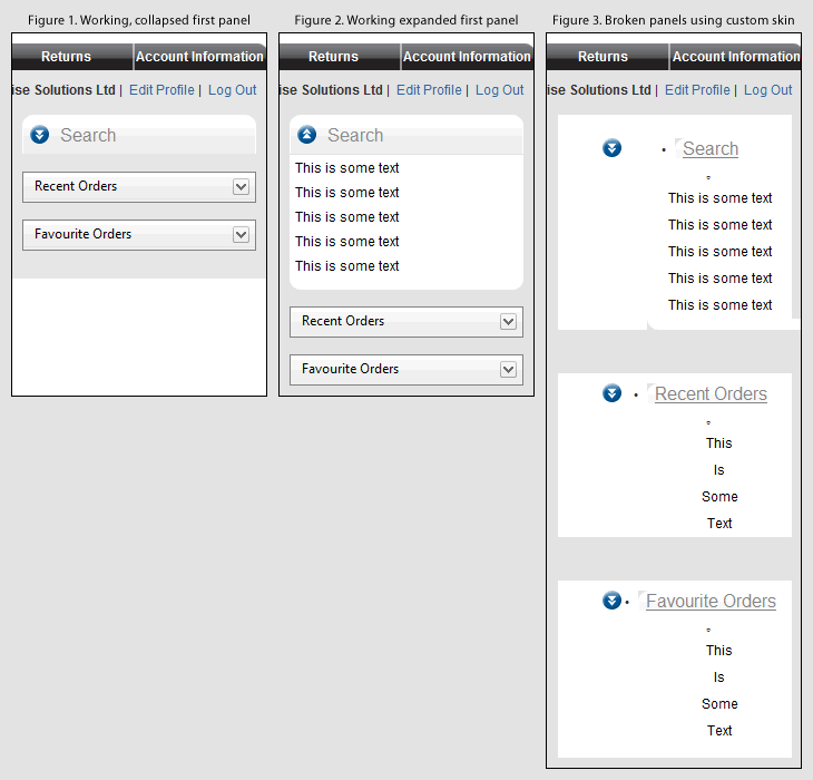 <asp:ScriptManager ID="ScriptManager1" runat="server"></asp:ScriptManager> <asp:UpdatePanel ID="UpdatePanel1" runat="server"> <ContentTemplate> <%--Working! Multiple RadPanels, but only one panel has custom skin...--%> <div class="Container210"><%-- div is 210 wide with overflow: visible; --%> <div class="PanelContainer210"> <%-- div is 210 wide with overflow: visible; --%> <telerik:RadPanelBar ID="SearchPanel" runat="server" EnableEmbeddedSkins="false" EnableEmbeddedBaseStylesheet="false" Skin="Panel210" Width="210" > <CollapseAnimation Duration="100" Type="Linear" /> <ExpandAnimation Duration="100" Type="Linear" /> <Items> <telerik:RadPanelItem Value="Search" Text="Search" > <Items> <telerik:RadPanelItem> <ItemTemplate> <div class="PanelTemplate210"> This is some text<br /> This is some text<br /> This is some text<br /> This is some text<br /> This is some text </div> <img src="../App_Themes/ServiceTrack.Net/Images/Furniture/Box210Bottom.png" /> <%--gives expanded panel round bottom--%> </ItemTemplate> </telerik:RadPanelItem> </Items> </telerik:RadPanelItem> </Items> </telerik:RadPanelBar> </div> <br /> <div class="PanelContainer210"><%-- div is 210 wide with overflow: visible; --%> <telerik:RadPanelBar ID="RecentOrdersPanel" runat="server" EnableEmbeddedSkins="true" Width="210" > <CollapseAnimation Duration="100" Type="Linear" /> <ExpandAnimation Duration="100" Type="Linear" /> <Items> <telerik:RadPanelItem Value="RecentOrders" Text="Recent Orders" > <Items> <telerik:RadPanelItem> <ItemTemplate> This<br /> Is <br /> Some<br /> Text<br /> </ItemTemplate> </telerik:RadPanelItem> </Items> </telerik:RadPanelItem> </Items> </telerik:RadPanelBar> </div> <br /> <div class="PanelContainer210"><%-- div is 210 wide with overflow: visible; --%> <telerik:RadPanelBar ID="FavouriteOrdersPanel" runat="server" EnableEmbeddedSkins="true" Width="210" > <CollapseAnimation Duration="100" Type="Linear" /> <ExpandAnimation Duration="100" Type="Linear" /> <Items> <telerik:RadPanelItem Value="FavouriteOrders" Text="Favourite Orders" > <Items> <telerik:RadPanelItem> <ItemTemplate> This<br /> Is <br /> Some<br /> Text<br /> </ItemTemplate> </telerik:RadPanelItem> </Items> </telerik:RadPanelItem> </Items> </telerik:RadPanelBar> </div> </div> <%--Broken! Multiple RadPanels using the same custom Skin --%> <div class="Container210"> <%-- div is 210 wide with overflow: visible; --%> <div class="PanelContainer210"> <%-- div is 210 wide with overflow: visible; --%> <telerik:RadPanelBar ID="SearchPanel2" runat="server" EnableEmbeddedSkins="false" EnableEmbeddedBaseStylesheet="false" Skin="Panel210" Width="210" > <CollapseAnimation Duration="100" Type="Linear" /> <ExpandAnimation Duration="100" Type="Linear" /> <Items> <telerik:RadPanelItem Value="Search" Text="Search" > <Items> <telerik:RadPanelItem> <ItemTemplate> <div class="PanelTemplate210"> This is some text<br /> This is some text<br /> This is some text<br /> This is some text<br /> This is some text </div> <img src="../App_Themes/ServiceTrack.Net/Images/Furniture/Box210Bottom.png" /> <%--gives expanded panel round bottom--%> </ItemTemplate> </telerik:RadPanelItem> </Items> </telerik:RadPanelItem> </Items> </telerik:RadPanelBar> </div> <br /> <div class="PanelContainer210"> <%-- div is 210 wide with overflow: visible; --%> <telerik:RadPanelBar ID="RecentOrdersPanel2" runat="server" EnableEmbeddedSkins="false" EnableEmbeddedBaseStylesheet="false" Skin="Panel210" Width="210" > <CollapseAnimation Duration="100" Type="Linear" /> <ExpandAnimation Duration="100" Type="Linear" /> <Items> <telerik:RadPanelItem Value="RecentOrders" Text="Recent Orders" > <Items> <telerik:RadPanelItem> <ItemTemplate> This<br /> Is <br /> Some<br /> Text<br /> </ItemTemplate> </telerik:RadPanelItem> </Items> </telerik:RadPanelItem> </Items> </telerik:RadPanelBar> </div> <br /> <div class="PanelContainer210"> <%-- div is 210 wide with overflow: visible; --%> <telerik:RadPanelBar ID="FavouriteOrdersPanel2" runat="server" EnableEmbeddedSkins="false" EnableEmbeddedBaseStylesheet="false" Skin="Panel210" Width="210" > <CollapseAnimation Duration="100" Type="Linear" /> <ExpandAnimation Duration="100" Type="Linear" /> <Items> <telerik:RadPanelItem Value="FavouriteOrders" Text="Favourite Orders" > <Items> <telerik:RadPanelItem> <ItemTemplate> This<br /> Is <br /> Some<br /> Text<br /> </ItemTemplate> </telerik:RadPanelItem> </Items> </telerik:RadPanelItem> </Items> </telerik:RadPanelBar> </div> </div> </ContentTemplate> </asp:UpdatePanel> 0