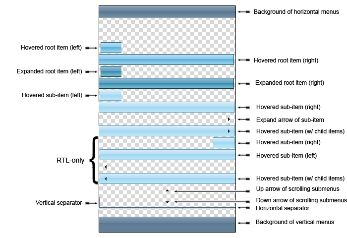 Ok thanks. I have another request... I'm trying to modify all the states of the buttons in my panelbar and my menu but I can't know exactly what, in the images (Panelbar : Expandable.png, RootItemBg.gif, SubItemStates.png, Menu : rmSprite.png, rmVSprite.png) are each states. It's long to check in the css files what are the background position for each state and check this in the image. Can you take this images and mark on them what are each state, for the panelbar and the menu (default skin).