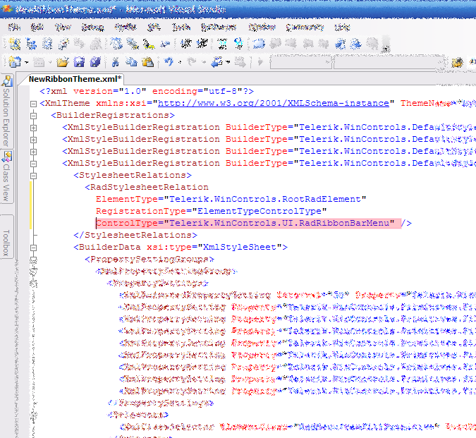 3) Now open the saved theme file (XML), with your favorite XML editor, like VS 2005 and search for the string "Telerik.WinControls.UI.RadDropDownMenu". Replace it with "Telerik.WinControls.UI.RadRibbonBarMenu"