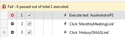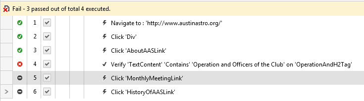 When a test step fails every step following it is supposed to be marked "Not Run" as shown in the two attached screen shots. You have stated "in execution report,all are showing as passed". This is not right or normal. We need to get to the bottom of why this is happening in your tests. Please share with me the test log or results showing everything as passed as you describe. This will be more fruitful then trying to figure out how to force steps to be skipped since our runner is supposed to be doing that for you already.