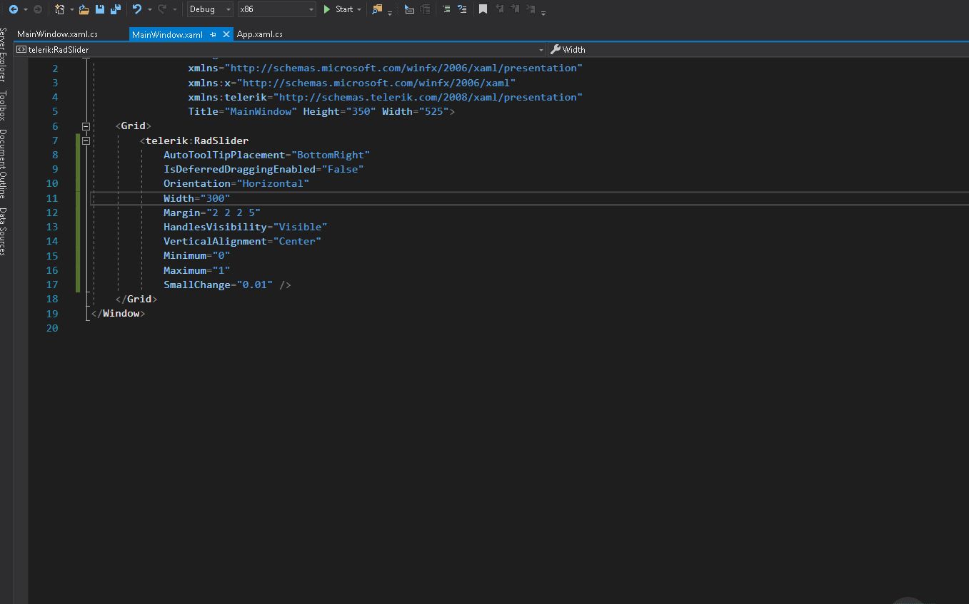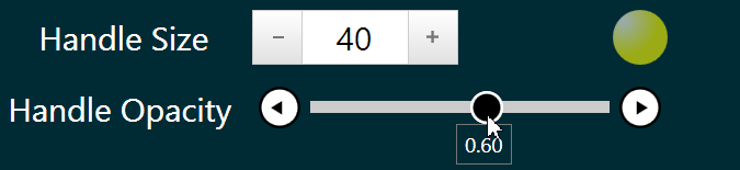 <tk:RadSlider Grid.Row="8" Grid.Column="2" Grid.ColumnSpan="3" AutoToolTipPlacement="BottomRight" Minimum="0.0" Maximum="1.0" IsDeferredDraggingEnabled="False" Orientation="Horizontal" HorizontalAlignment="Center" SmallChange="0.01" Width="300" Margin="2 2 2 5" HandlesVisibility="Visible" Value="{Binding Source={x:Static core:Settings.Default}, Path=ShapeHandleOpacity, Mode=TwoWay}" />