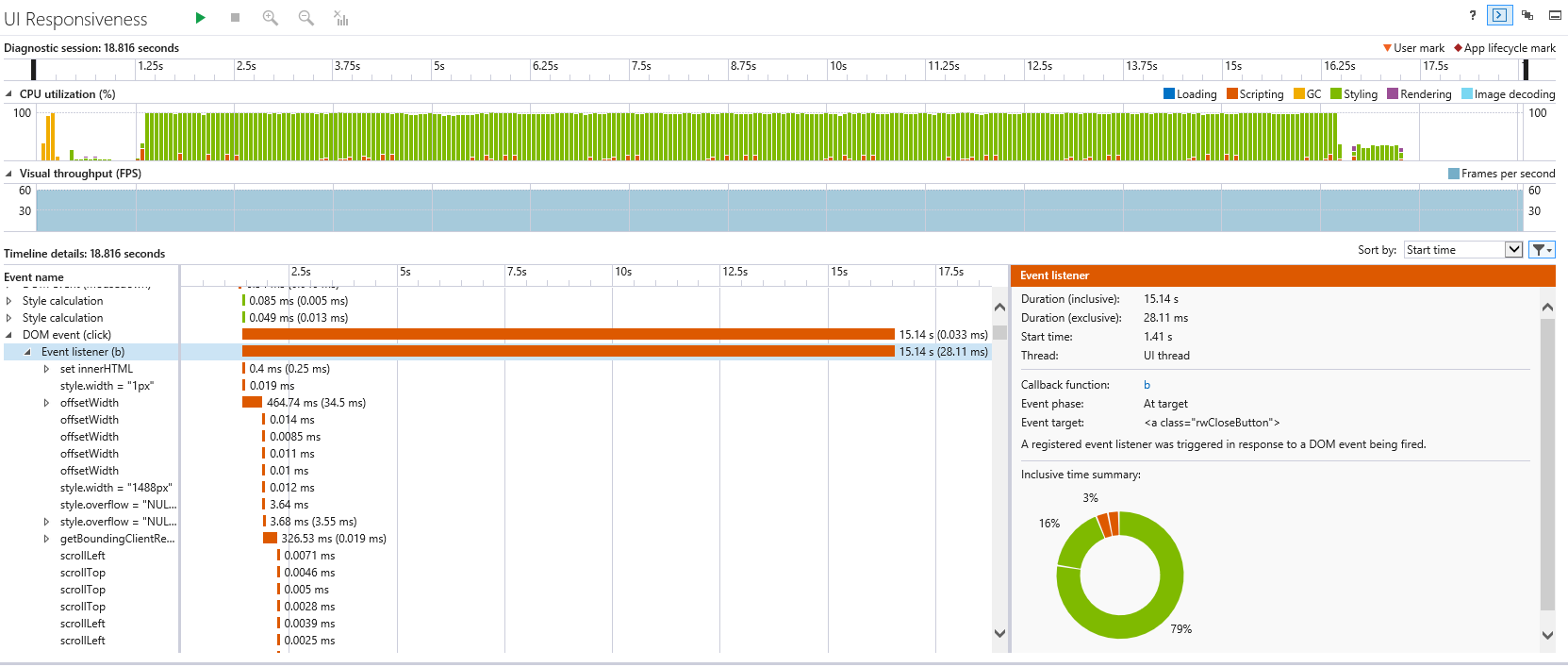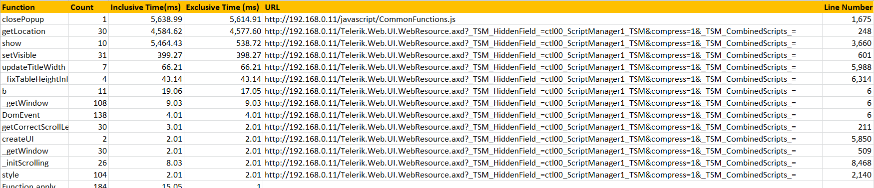 function closePopup() {var oWindow =GetRadWindow(); if (oWindow != null) { oWindow.close();} return false;}I have run the profiler in IE8 developer tools and have attached the results. Any help you could give would be greatly appreciated
