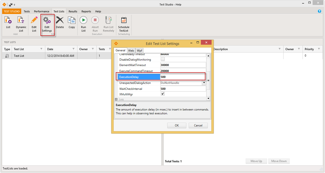 1. Create a test list and from the test list properties set an Execution delay (see the attached screen shot). The amount of execution delay (in msec) to insert between every step in the test.