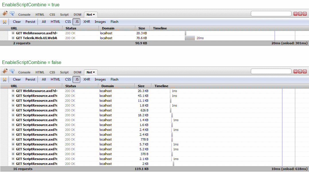 And the size of the combined script is much larger than seperated script resources.