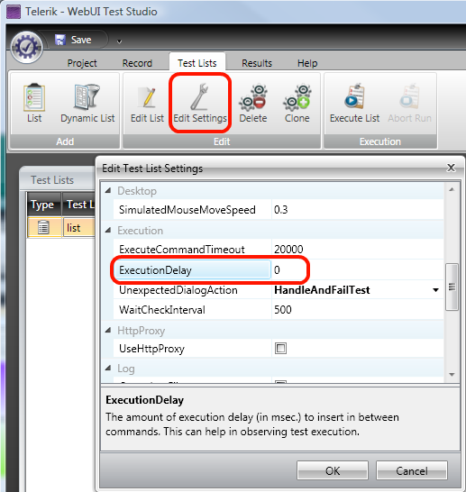 2) As part of a test list you can adjust the execution delay in the test list settings. The default for this setting is 0 i.e. no delay.