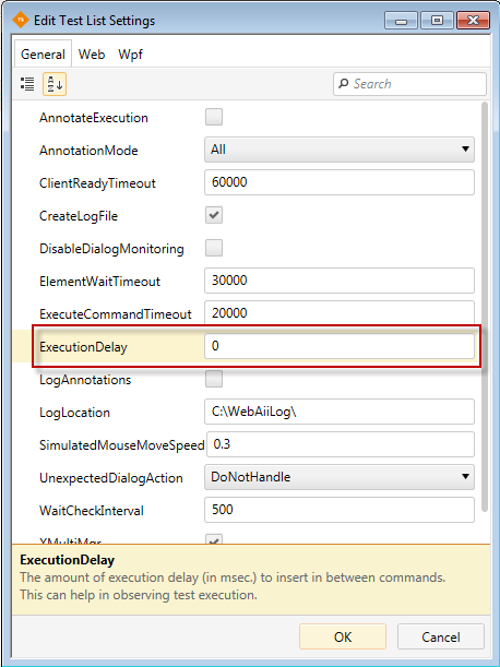 If you are executing your tests in a test list, you can set the ExecutionDelay setting in order to slow down the execution. The default value is 0. Refer to the ExecutionDelay screenshot.