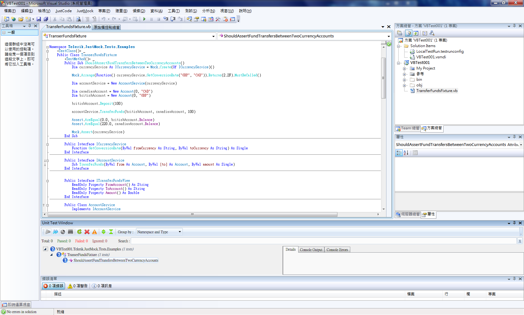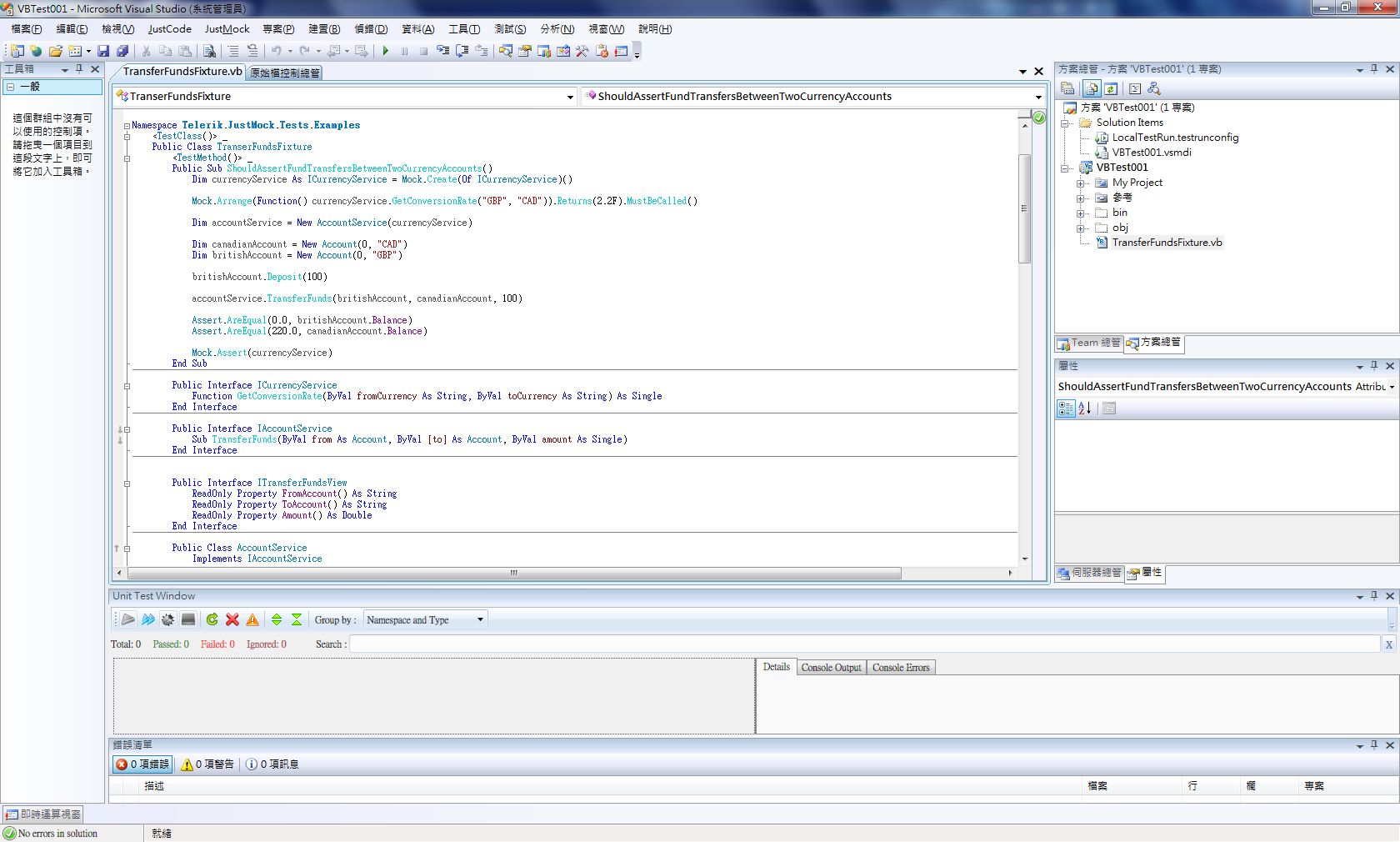 It cannot work using transferfundsfixture.zip, but the test item "ShouldAssertFundTransfersBetweenTwoCurrencyAccounts" shows "Not Executed in Unit Test Window." Why is it? May I have another example in VB.Net and in Visual Studio 2008?