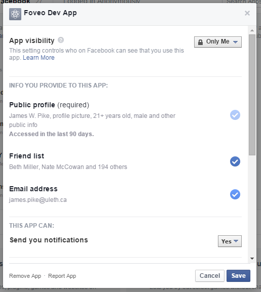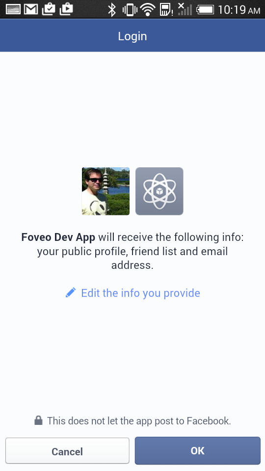 https://graph.facebook.com/me?access_token=<access-token>where the <access-token> is changed for the actual token you obtained for the user that logged in your app.
