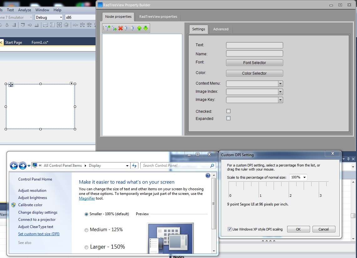 1. Thank you for bringing our attention to this issue. I managed to reproduce it by using custom DPI settings. I logged the issue in our issue tracking system and it will be addressed in one of our upcoming releases. I added also Telerik points in your account. You can work around the issue by resetting your DPI settings to their default value - 100%.