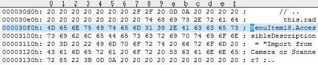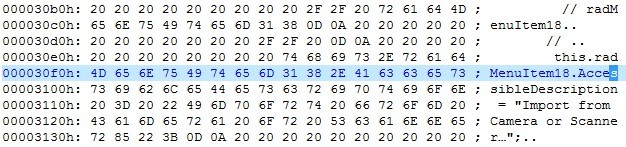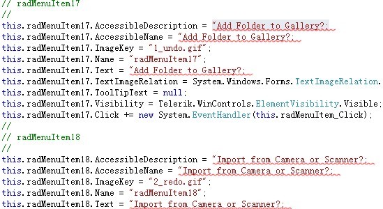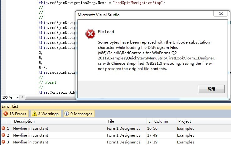 2.Because your OS is English,you'll not experience similar issues.It's telerik's demo application.First,I open Sample C# Solution in Visual studio 2010 (2.jpg), Vs2010 will show 3.jpg,then I click 确定 (OK) button and open D:\Program Files (x86)\Telerik\RadControls for WinForms Q2 2011\Examples\QuickStart\MenuStrip\FirstLook\Form1.Designer.cs,we'll see 4.jpg,you must notice some ? character and " is missing.In this situation,we can not build this solution.If you look this file in hex mode,you'll see 5.jpg.Changing the region and language in ControlPanel to English,We can rebuild it.If you open the former .cs file,you'll see 6.jpg. Using a Hex editor and opening