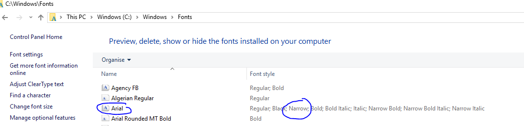 Some examples: Arial Black, Arial Narrow, Bodoni MT Black, Bodoni MT Condensed,Calibri Light, Franklin Gothic Medium, ...