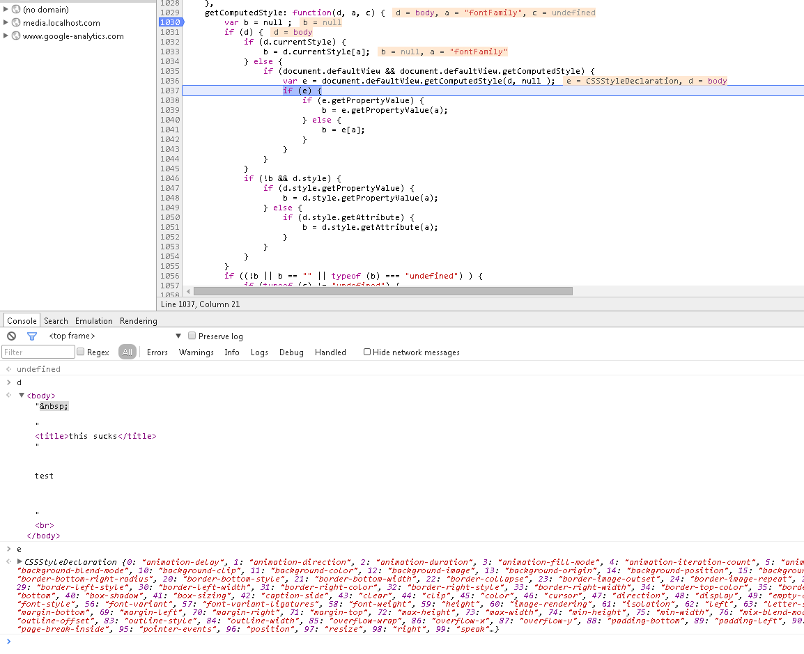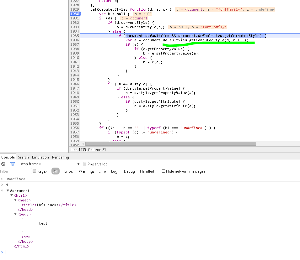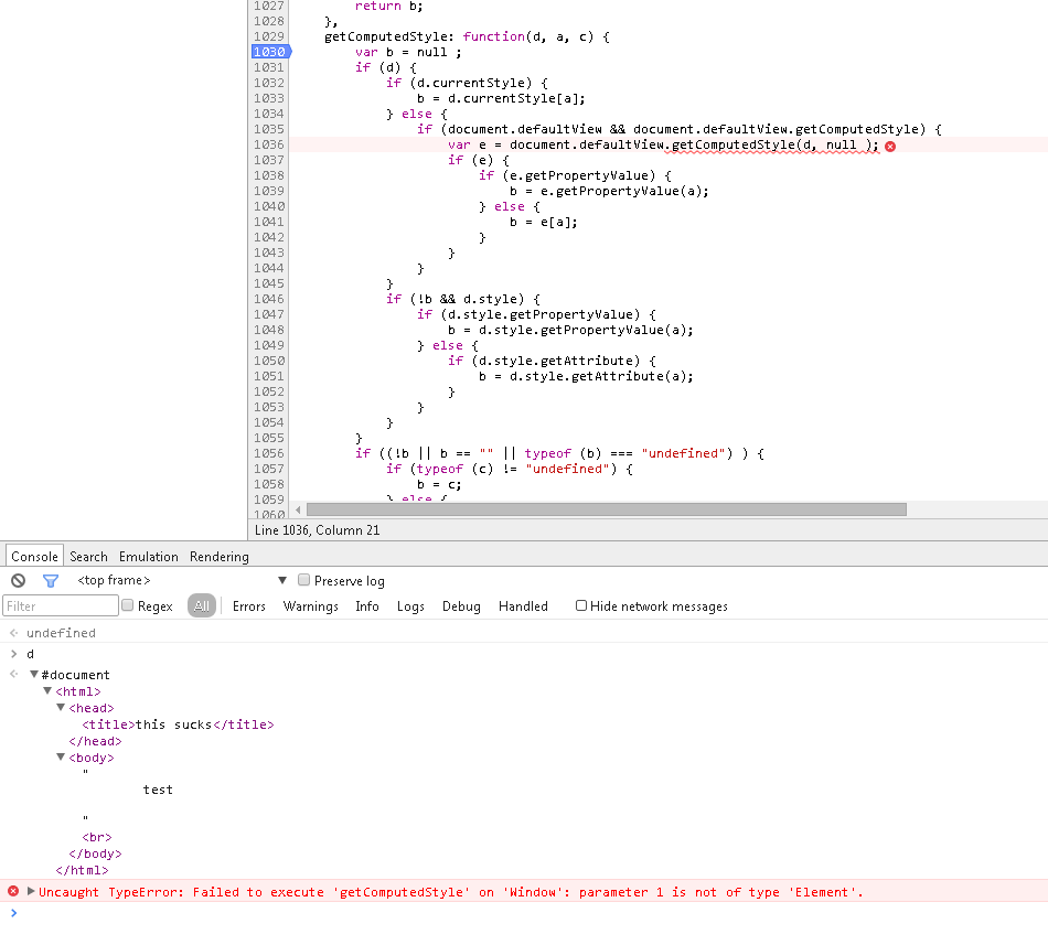 1.<html>2.<head>3.<title>this sucks</title>4.</head>5.<body>6.test7.</body>8.</html>I'm convinced this is a Telerik issue with handling the HTML contents of the editor. If I dig into the ScriptResource.axd files I've narrowed it down to this bit of code in getComputedStyle.