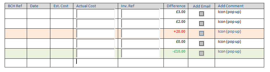 The columns Actual Cost, Inv. Ref, Difference, Add Email, and Add Comment are not coming from DB. They are unbound as they do not exists. I can manage Add Email and Comment. However, once displayed to the user, the Actual Cost, Invoice Reference, and Difference columns are to be blank (row-wise, of course). When I enter something in Actual Cost against a row, the Difference column must show Est. Cost - Actual Cost. Also, the Est Cost, Actual Cost, and Difference are all currencies so having a Numerical input with two decimals is very desired. The Est. Cost is a bound column so masking is no issue there.