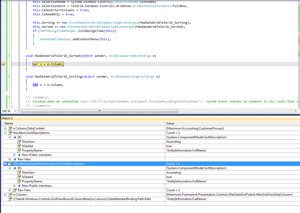 Also attach to the "Sorted Event" to try "grid.Items.Refresh()..." and check properties values (see sort2.png)