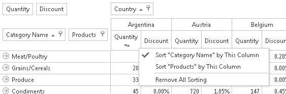For the time being, the PivotGrid allows to sort the dimensions only by label values. That being said, you can sort the tuples of one dimension. Sorting by values is not supported.