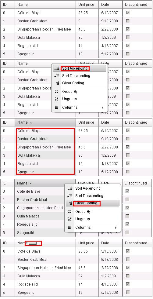 <telerik:RadGrid ID="MyRadGrid" runat="server" AllowSorting="true" EnableHeaderContextMenu="true" Width="900px" CssClass="RadGridCustomClass"> <ClientSettings AllowColumnsReorder="true" ReorderColumnsOnClient="true" ColumnsReorderMethod="Reorder" AllowColumnHide="true" > <Resizing AllowColumnResize="true" EnableRealTimeResize="true" ResizeGridOnColumnResize="true" ClipCellContentOnResize="true" AllowRowResize="false" /> </ClientSettings> <HeaderContextMenu EnableRoundedCorners="true" EnableShadows="true" OnItemClick="MyRadGrid_HeaderContextMenuClick" /> <MasterTableView AllowMultiColumnSorting="false" AllowCustomSorting="true" AllowCustomPaging="true" TableLayout="Fixed" AutoGenerateColumns="false" EnableHeaderContextMenu="true" EnableViewState="false" > <Columns> <telerik:GridBoundColumn DataField="ID" SortExpression="ID" HeaderText="ID" DataType="System.Int32" /> <telerik:GridBoundColumn DataField="Name" SortExpression="Name" HeaderText="Name" DataType="System.String" /> <telerik:GridNumericColumn DataField="UnitPrice" SortExpression="UnitPrice" HeaderText="Unit price" DataType="System.Decimal" /> <telerik:GridBoundColumn DataField="Date" SortExpression="Date" DataFormatString="{0:d}" HeaderText="Date" DataType="System.DateTime" /> <telerik:GridCheckBoxColumn DataField="Discontinued" SortExpression="Discontinued" HeaderText="Discontinued" DataType="System.Boolean" /> </Columns></MasterTableView></telerik:RadGrid>Pretty simple grid with simple data i load from a list for this test purpose.