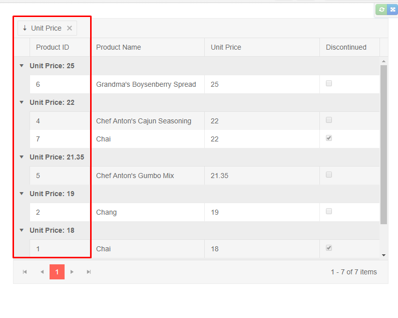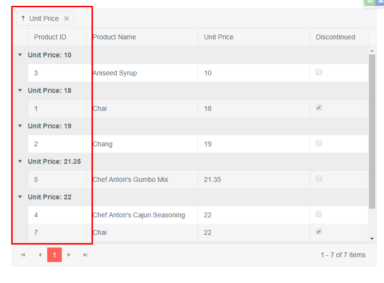 But Sorting on UnitPrice does not work, i.e. I expect to see the group header to show highest UnitPrice (e.g. Unit Price: 25) for descending order as first group header of the grid.