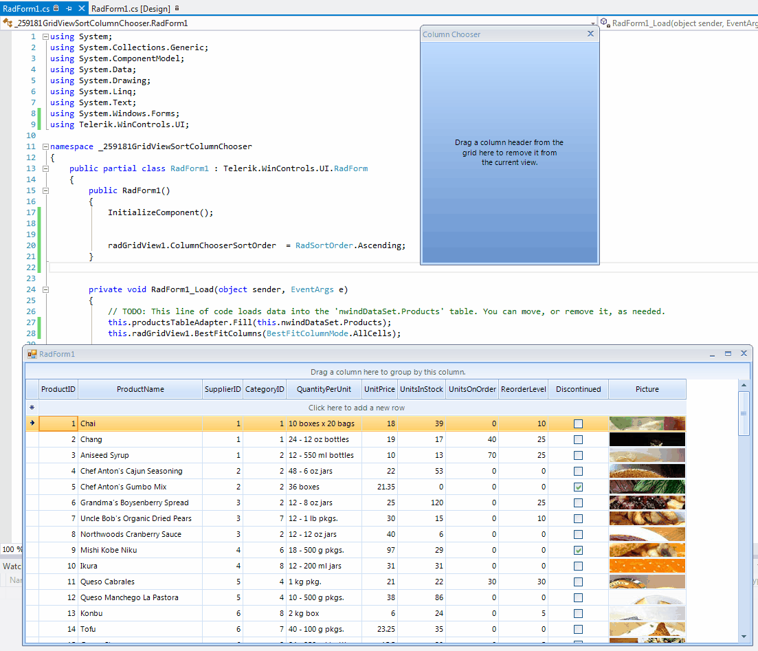 radGridView1.ColumnChooser.SortOrder = RadSortOrder.Ascending;void radGridView1_ColumnChooserCreated(object sender, ColumnChooserCreatedEventArgs e){ e.ColumnChooser.SortOrder = RadSortOrder.Ascending;}Using the ColumnChooserEvent is important, as the column chooser instance is recreated on demand. This ensures that you will always work with valid instance of it.