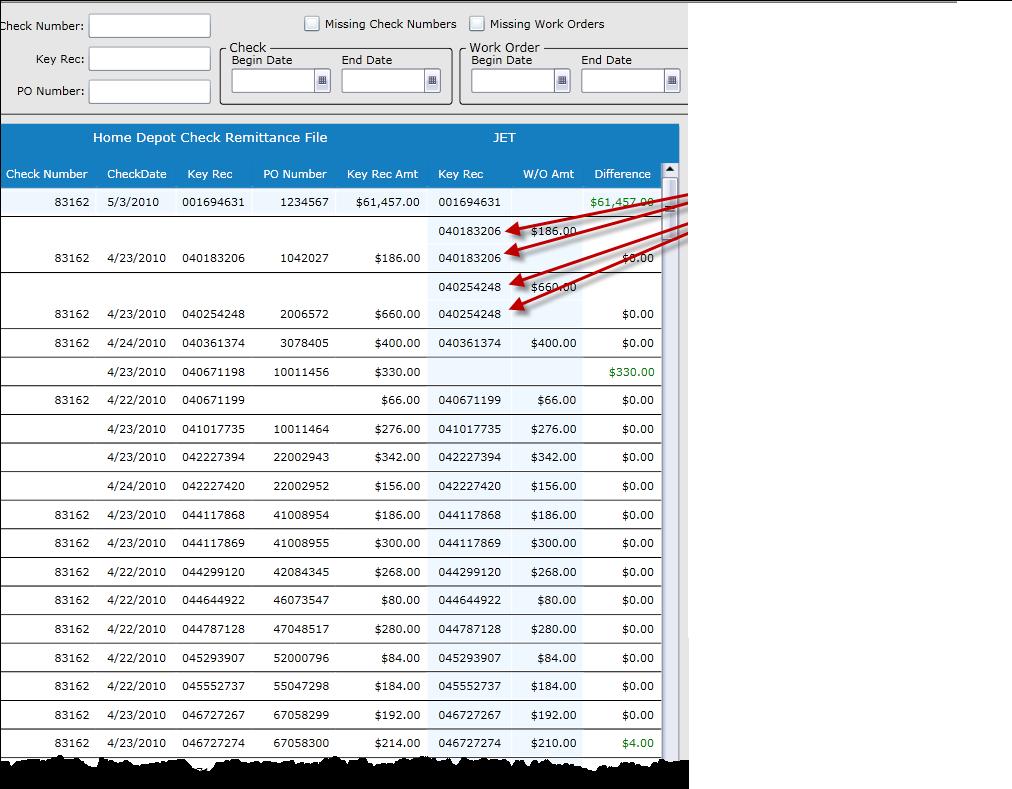 table 1: PK,CheckNUmber,Checkdate,KeyRec,PO Number,KeyRecAmount