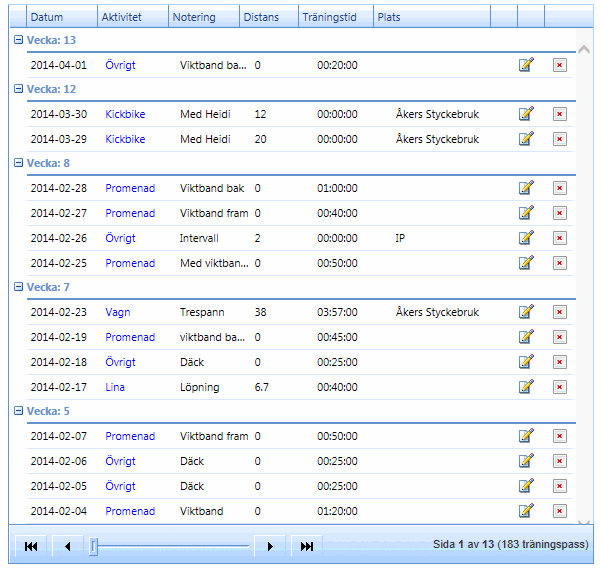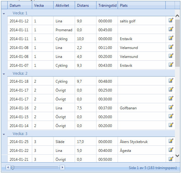 <telerik:RadScriptManager ID="RadScriptManager1" runat="server" /> <telerik:RadSkinManager ID="RadSkinManager1" Skin="Office2007" runat="server" /> <telerik:RadAjaxManager ID="RadAjaxManager1" runat="server"> <AjaxSettings> <telerik:AjaxSetting AjaxControlID="RadGrid1"> <UpdatedControls> <telerik:AjaxUpdatedControl ControlID="RadGrid1" LoadingPanelID="RadAjaxLoadingPanel1" /> </UpdatedControls> </telerik:AjaxSetting> </AjaxSettings> </telerik:RadAjaxManager> <telerik:RadAjaxLoadingPanel ID="RadAjaxLoadingPanel1" runat="server" /> <telerik:RadCodeBlock ID="RadCodeBlock1" runat="server"> <script type="text/javascript"> function RowDblClick(sender, eventArgs) { window.radopen("visa_trainingdog.aspx?id=" + eventArgs.getDataKeyValue("id"), "RadWindow1"); } </script> </telerik:RadCodeBlock><telerik:RadGrid ID="RadGrid1" runat="server"AllowSorting="true"AllowPaging="true"CellSpacing="0"Culture="sv"DataSourceID="sdsMedlem"EnableLinqExpressions="false"GridLines="None"PageSize="40"Width="100%"> <MasterTableView AutoGenerateColumns="False" DataKeyNames="id" ClientDataKeyNames="id" TableLayout="Fixed"> <GroupByExpressions> <telerik:GridGroupByExpression> <SelectFields> <telerik:GridGroupByField FieldName="weeknumber" FieldAlias="Vecka" /> </SelectFields> <GroupByFields> <telerik:GridGroupByField FieldName="weeknumber" SortOrder="None" /> </GroupByFields> </telerik:GridGroupByExpression> </GroupByExpressions> <PagerStyle Mode="Slider" PagerTextFormat="{4} Sida {0} av {1} ({5} träningspass)" /> <Columns> <telerik:GridBoundColumn DataField="id" Display="false" /> <telerik:GridBoundColumn DataField="datum" DataFormatString="{0:yyyy-MM-dd}" DataType="System.DateTime" HeaderText="Datum" HeaderStyle-Width="80px" /> <telerik:GridBoundColumn DataField="weeknumber" HeaderText="Vecka" DataType="System.Int32" HeaderStyle-Width="70px" /> <telerik:GridBoundColumn DataField="aktivitet" HeaderText="Aktivitet" HeaderStyle-Width="70px" /> <telerik:GridBoundColumn DataField="distans" HeaderText="Distans" HeaderStyle-Width="70px" /> <telerik:GridBoundColumn DataField="exercise" HeaderText="Träningstid" DataType="System.DateTime" HeaderStyle-Width="80px" /> <telerik:GridBoundColumn DataField="plats" HeaderText="Plats" /> <telerik:GridTemplateColumn HeaderButtonType="TextButton" HeaderStyle-Width="30px"> <ItemTemplate> <asp:LinkButton ID="lbVisa" ImageAlign="AbsMiddle" Text='<img src="../../../picture/mini/edit.gif" width="18" height="18" border="0" />' Tooltip="Uppdatera träningspass" CommandArgument='<%# Container.DataItem("id") %>' OnClick="Visa" PostBackUrl="~/medlemsidor/minsida/trainingdog/edittrainingdog.aspx" runat="server" /> </ItemTemplate> </telerik:GridTemplateColumn> </Columns> </MasterTableView> <ClientSettings EnableRowHoverStyle="True" AllowColumnsReorder="true"> <Resizing AllowColumnResize="true" /> <ClientEvents OnRowDblClick="RowDblClick" /> <ClientMessages PagerTooltipFormatString="" /> <Selecting AllowRowSelect="True" /> <Scrolling AllowScroll="True" UseStaticHeaders="True" ScrollHeight="490px" /> </ClientSettings></telerik:RadGrid> <telerik:RadWindowManager ID="RadWindowManager1" Behaviors="Close" RestrictionZoneID="zoneID1" runat="server"> <Windows> <telerik:RadWindow ID="RadWindow1" Width="602px" Height="400px" Top="118px" Left="-6" EnableShadow="true" ReloadOnShow="true" ShowContentDuringLoad="false" Modal="true" VisibleStatusbar="false" runat="server"> </telerik:RadWindow> </Windows> </telerik:RadWindowManager> <asp:SqlDataSource ID="sdsMedlem" runat="server" ConnectionString="<%$ ConnectionStrings:MyInlogg %>" ProviderName="System.Data.SqlClient" SelectCommand="select * from dogtraining where fidnr = @fidnr Order By datum DESC"> <SelectParameters> <asp:Parameter Name="fidnr" /> </SelectParameters> </asp:SqlDataSource>0