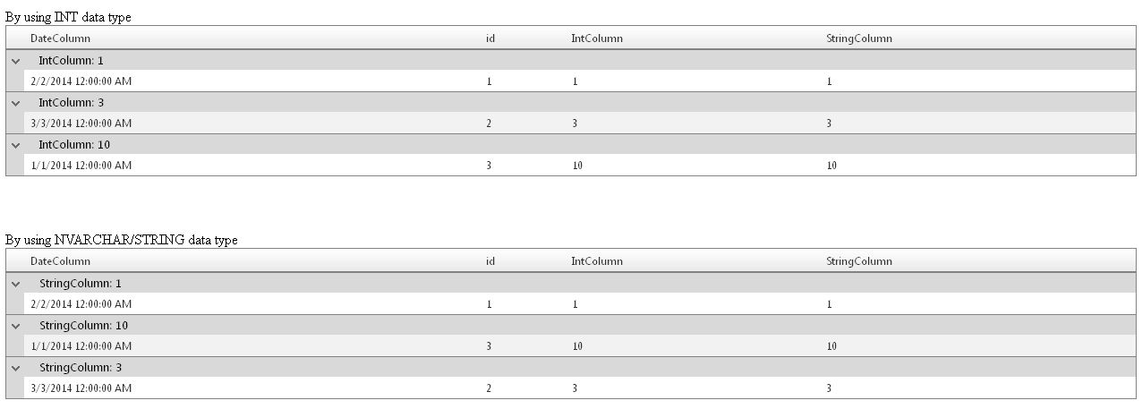 Additionally please note that the RadGrid groups data internally and you can sort the grid only by the field which is used for grouping (into my example the weeknumber field). Grouping by one field and sorting by another is not supported scenario because the groups will be invalid. If you want to sort grouped grid by different field the data into the groups will be sorted, but the groups will stay in the same order. You can inspect this behavior in the following demo: