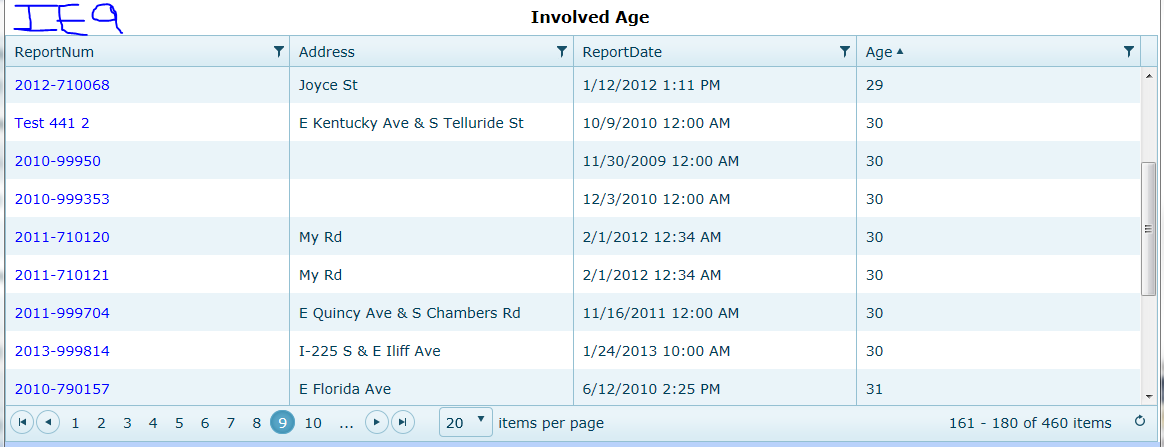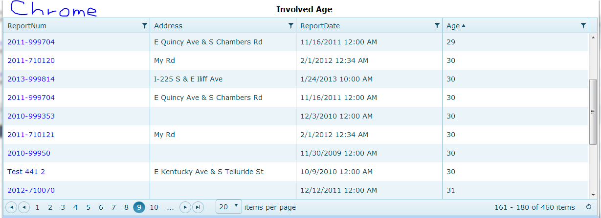 Possible Bug: Internet Explorer and Chrome sort the values differently. Being an age colum, the numbers are grouped correctly but withing the 'Age = 15 rows' the order is not the same. The orders are reversed from each other as far as I can tell with my limited testing.