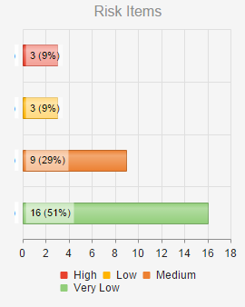 [{"Share":3,"VisibleInLegend":true,"Color":"#E8412D","category":"High","SortOrder":4,"PercentageField":"9%"},{"Share":9,"VisibleInLegend":true,"Color":"#ED8132","category":"Medium","SortOrder":3,"PercentageField":"29%"},{"Share":3,"VisibleInLegend":true,"Color":"#FFB400","category":"Low","SortOrder":2,"PercentageField":"9%"},{"Share":16,"VisibleInLegend":true,"Color":"#92CE7A","category":"Very Low","SortOrder":1,"PercentageField":"51%"}]​