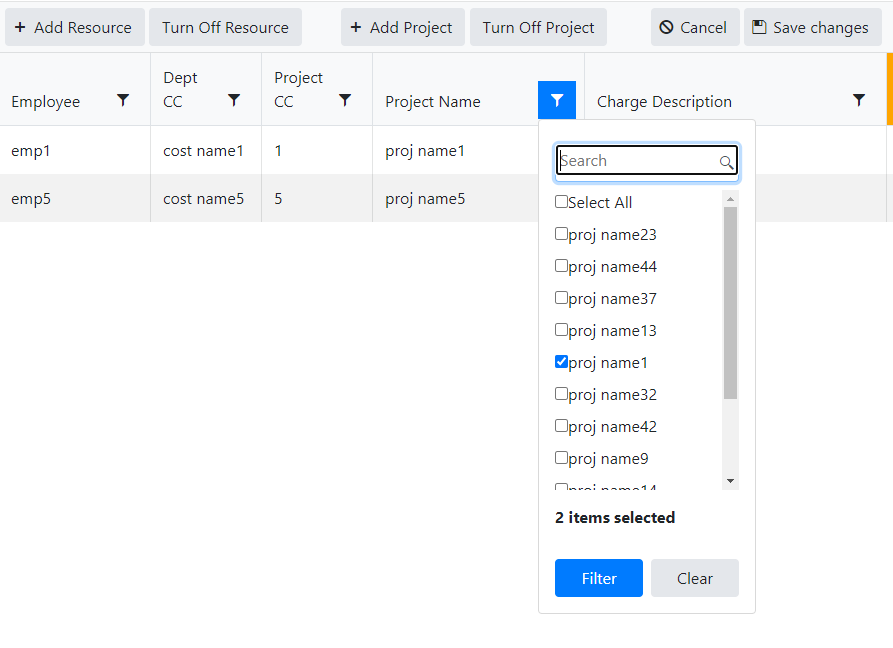- Declare the DataSource and set it as the one the multi checkbox filter to use in the desired columns: