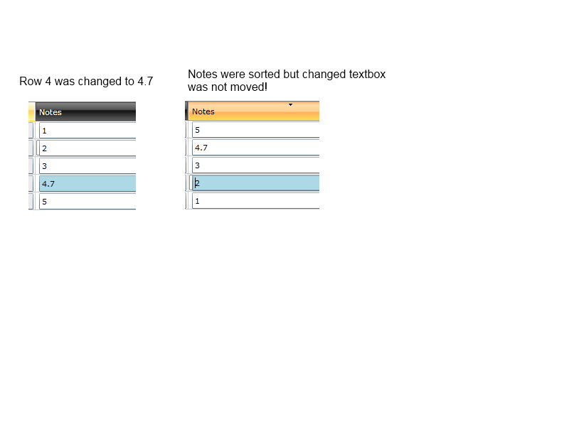 Example: Have 5 rows 1 to 5. Each row got one column with text box, they have values 1 to 5. If I change the value in row 4 to 4.5 this textbox will go blue. Then if I sort descending the sort will work fine but the blue textbox has not moved eg will still be on the row 4 instead of row 2.