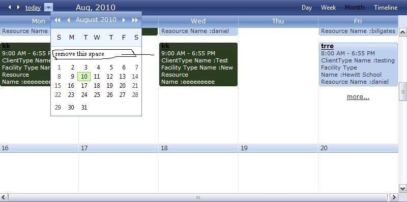 Hi Team,I've implemented the Rad Scheduler. WHile i click the calender picker i found a single line space. That looks uneven.I need to remove the single line space.I've attached the image of that calender picker and also pasted the scheduler codePlease review it and get me a solution as quick as.<telerik:RadScheduler runat="server" ID="RadScheduler1" Skin="Web20" CustomAttributeNames="StartTime,EndTime"SelectedDate="2010-08-10" DataStartField="EventStartDate" EnableDatePicker="true"GroupingDirection="Horizontal" MonthView-GroupingDirection="Horizontal" DataEndField="EventEndDate"DayStartTime="08:00:00" DayEndTime="23:00:00" ShowFullTime="true" DataKeyField="ID" style="white-space:normal;"FirstDayOfWeek="Monday" LastDayOfWeek="Friday" DataSubjectField="DisplayPermitName"EnableEmbeddedSkins="false" AllowDelete="false" AllowEdit="false" TimelineView-NumberOfSlots="4" AllowInsert="false" OnAppointmentDataBound="RadScheduler1_AppointmentDataBound"OnDataBound="RadScheduler1_OnDataBound" >Thanks,Daniel.B