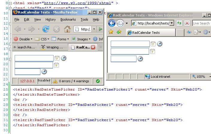 Please find attached a screenshot, which shows how the latest official versions of RadDateTimePickers (Web20 skin) should look in IE and Firefox. If they look different in your web applications, then there is something which interferes with their styles. In that case, please supply some sample code to look at and investigate. Thank you in advance.