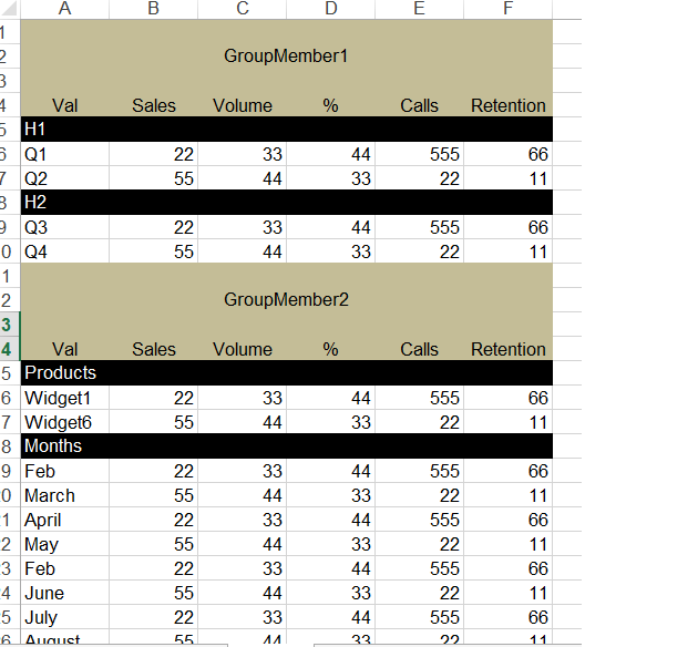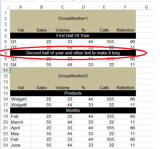 Dataset is preformatted, and can't easily change. Currently, the section headers are just treated as inline text in column 1, and background color for all cells is changed to black based off of a formatting field provided in the data. This works great (Existing.PNG).
