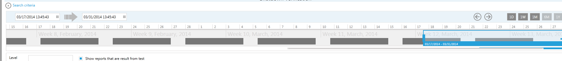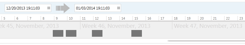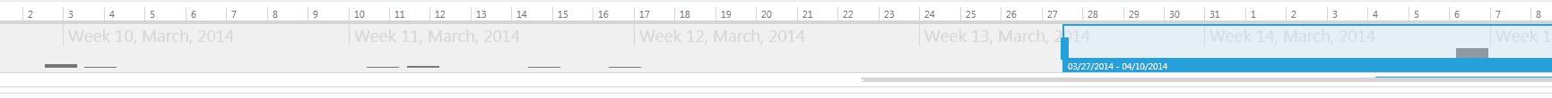 <telerik:RadTimeBar Margin="3" x:Name="Timebar" IsEnabled="{Binding IsTimeSelectionEnabled}" Grid.Row="1" VerticalAlignment="Top" Height="90" HorizontalAlignment="Stretch" PeriodStart="{Binding PeriodStart, Mode=TwoWay}" PeriodEnd="{Binding PeriodEnd, Mode=TwoWay}" VisiblePeriodStart="{Binding VisiblePeriodStart, Mode=TwoWay}" VisiblePeriodEnd="{Binding VisiblePeriodEnd, Mode=TwoWay}" SelectionStart="{Binding SelectionStart, Mode=TwoWay}" SelectionEnd="{Binding SelectionEnd, Mode=TwoWay}" > <i:Interaction.Triggers> <i:EventTrigger EventName="SelectionChanged"> <i:InvokeCommandAction Command="{Binding ApplyPeriodCommand}"/> </i:EventTrigger> </i:Interaction.Triggers> <telerik:RadTimeBar.Intervals> <telerik:MonthInterval /> <telerik:WeekInterval /> <telerik:DayInterval /> <telerik:HourInterval/> </telerik:RadTimeBar.Intervals> </telerik:RadTimeBar>The content is set as follows in the code behind: