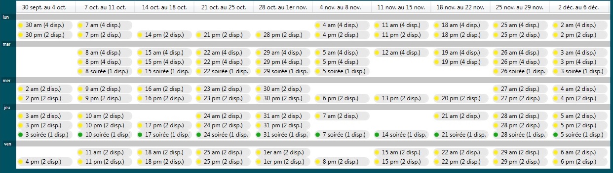 I need to represent from a starting date, for the next 10 weeks, all available free spots (AM/PM/Evening) for each deay of the week (with or without the weekend).