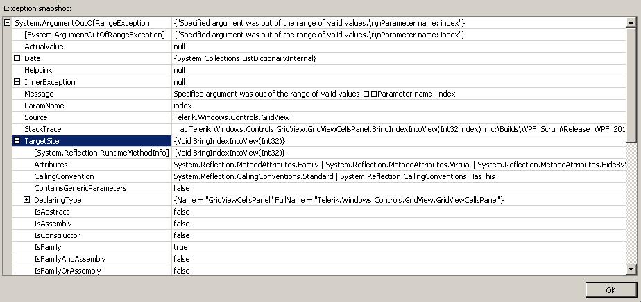 for Silverlight this time :) I did place a ticket to follow on this as I have no clue why the code stops at the end of events of the grid and also if I remove the event, it still crashes but this time even thought I have full try catch in every events for the grid it never catchs anything