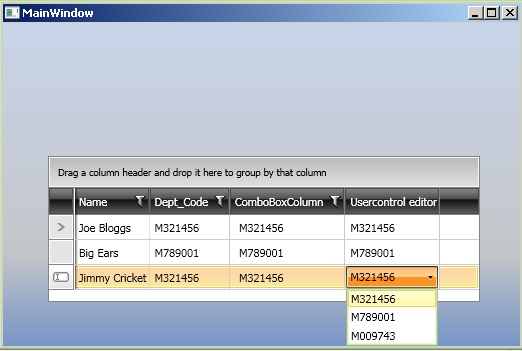 In the grid view the first two columns are read only. In the third column I'm using a GridViewComboBoxColumn. In this column the grid dept_code value is changed when I select a new value from the list (although I have to click out of the cell for the trigger; not sure why).