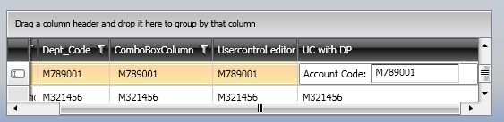 The last column demonstrates the issue I have. Because I want to use a more sophisticated selection mechanism I host the usercontrol in a CellEditTemplate (in this example a RadComboBox). The binding I have defined does not seem to link the grid Dept_Code with the selected item Account_Code which is what I need.