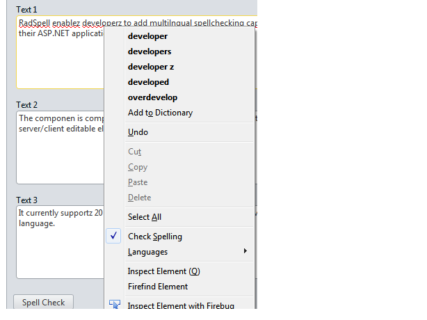 If you would like you can replace the textboxes with RadEditor and use its inline spellchecker. You can configure RadEditor to looks like a textarea as shown in this demo: Displaying RadEditor as a TextBox.