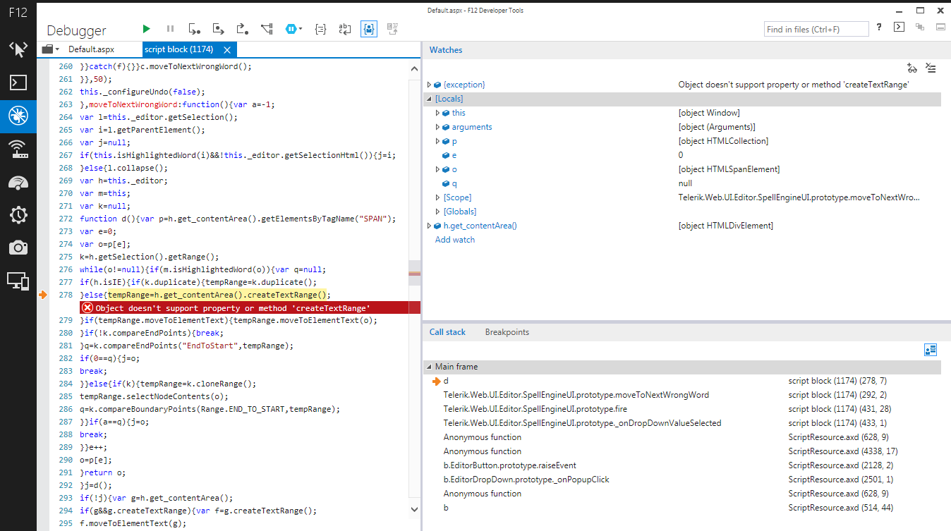 Also, in IE11, when the RadEditor is set to ContentAreaMode="Div" and contained inside an iframe, clicking on the spell check commands window for the first misspelled word results in the following JavaScript error: