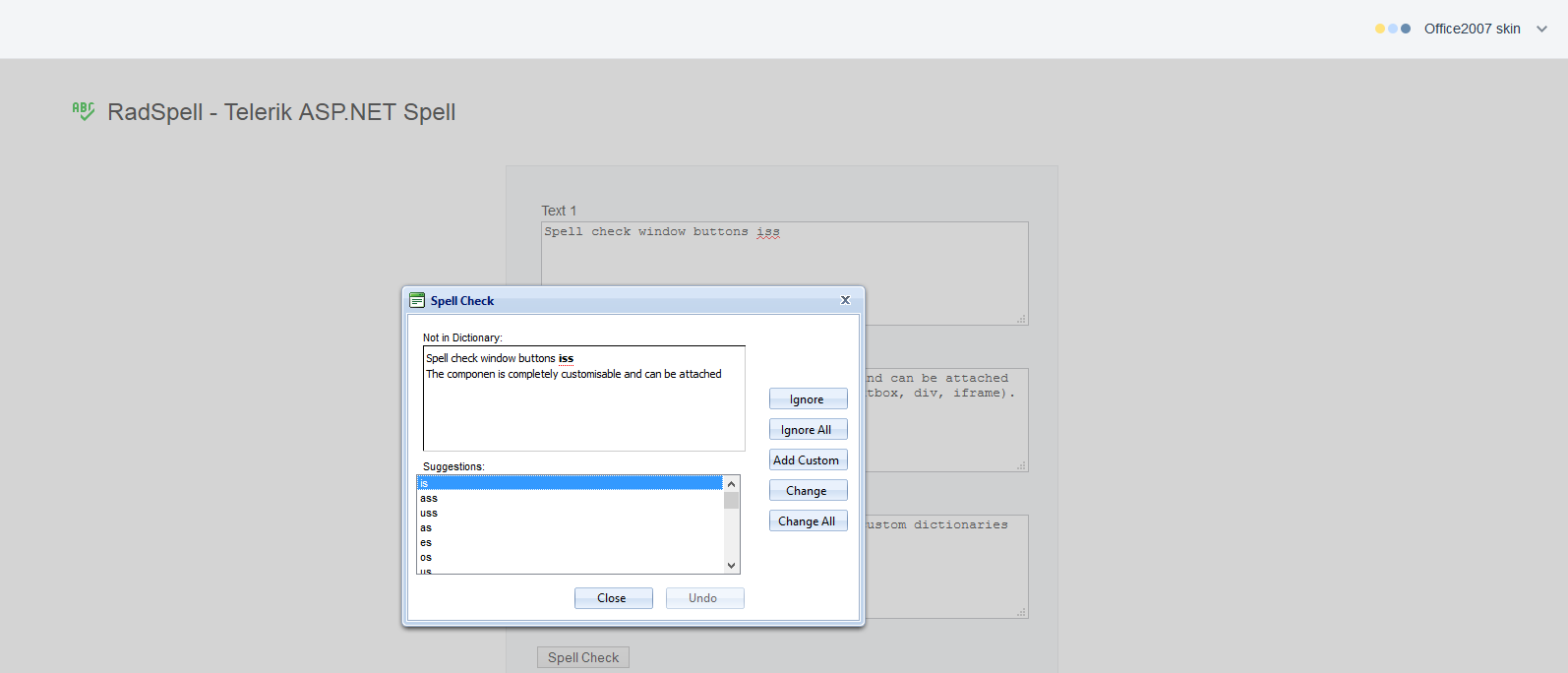 <telerik:RadSpell ID="rdlSpellChk" Skin="Office2007" runat="server" ControlToCheck="txtSourceLang" TabIndex="3" />