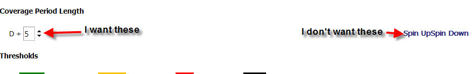 I think either I'm still not being clear, or we have a misunderstanding of what's going on. In my screen, I added a NumericTextBox with ShowSpinButtons = true. I appear to be getting several elements (The text box, arrors, AND hyperlinks). I don't want the hyperlinks. I've attached a picture with text to show what I want to do. If you are saying I need to right javascript to remove the hyperlinks yet keep the arrows, I would say this seems like a defect, no? Please see attachment.