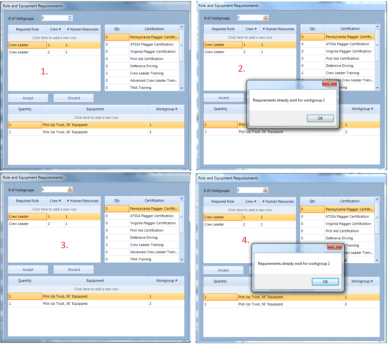 private void CrewQtyText_ValueChanging(object sender, Telerik.WinControls.UI.ValueChangingEventArgs e){ foreach (Telerik.WinControls.UI.GridViewRowInfo row in RequiredRolesGrid.Rows) { if (Convert.ToInt16(row.Cells["Workgroup"].Value) > Convert.ToInt16(e.NewValue)) { e.Cancel = true; break; } } if(!e.Cancel) foreach (Telerik.WinControls.UI.GridViewRowInfo row in RequiredEquipGrid.Rows) { if (Convert.ToInt16(row.Cells["Workgroup"].Value) > Convert.ToInt16(e.NewValue)) { e.Cancel = true; break; } } if (e.Cancel) MessageBox.Show("Requirements already exist for workgroup " + e.OldValue);}Basically if the user has other requirements that depend on the value in the spin editor I don't want them to be allowed to change the spinner. That seems to work fine, but the buttons on the spinner get stuck once the operation has been Cancelled, and the next time that button is pressed it behaves as though it was in it's old state. For example (assuming the spinner has an integer value), I increment the spinner to 3 (#1 from screen shot). Let's say the user has a requirement that prevents them from lowering the spinner value below 2. Now I decrement the spinner twice (#2 from screen shot). The first one works, lowering the value to 2. The second click causes the operation to be canceled. Now say I increment the value to 5 (#3 from screen shot, note 'depressed' spinner button'). The NEXT time I try to decrement (just once), the value returns to 2 (#4 from screen shot), the last value that caused the operation to be cancelled. I would expect it to return to 4, 3, then 2. You can see that the down button on the spinner stays highlighted after the operation is cancelled. I know this probably sounds confusing. Please try to follow the screen shot provided, and let me know if you need more detail.
