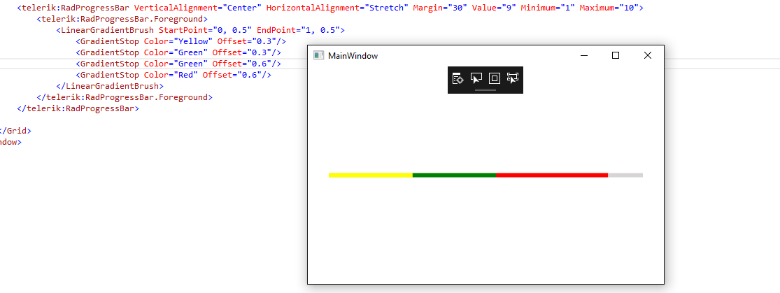 <telerik:RadProgressBar VerticalAlignment="Center" HorizontalAlignment="Stretch" Margin="30" Value="9" Minimum="1" Maximum="10"> <telerik:RadProgressBar.Foreground> <LinearGradientBrush StartPoint="0, 0.5" EndPoint="1, 0.5"> <GradientStop Color="Yellow" Offset="0.3"/> <GradientStop Color="Green" Offset="0.3"/> <GradientStop Color="Green" Offset="0.6"/> <GradientStop Color="Red" Offset="0.6"/> </LinearGradientBrush> </telerik:RadProgressBar.Foreground> </telerik:RadProgressBar>Regards,