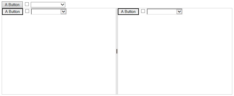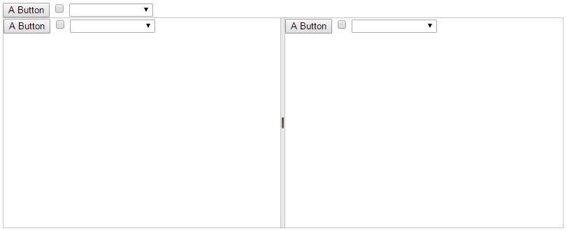 <!DOCTYPE html><html><head> <base href="http://demos.telerik.com/kendo-ui/splitter/index"> <link rel="stylesheet" href="http://cdn.kendostatic.com/2015.2.624/styles/kendo.common.min.css" /> <link rel="stylesheet" href="http://cdn.kendostatic.com/2015.2.624/styles/kendo.default.min.css" /> <script src="http://cdn.kendostatic.com/2015.2.624/js/jquery.min.js"></script> <script src="http://cdn.kendostatic.com/2015.2.624/js/kendo.all.min.js"></script></head><body><div id="example" style="height:300px; width: 800px"> <div id="outsideSplitter"> <input type="button" value="A Button"/> <input type="checkbox"/> <select style="width:120px"></select> </div> <div id="splitter" style="height: 100%; width: 100%;"> <div id="left-pane"> <div class="pane-content"> <div> <input type="button" value="A Button"/> <input type="checkbox"/> <select style="width:120px"></select> </div> </div> </div> <div id="right-pane"> <div class="pane-content"> <div> <input type="button" value="A Button"/> <input type="checkbox"/> <select style="width:120px"></select> </div> </div> </div> </div></div><script> $(document).ready(function() { $("#splitter").kendoSplitter({ panes: { collapsible: true } }); });</script></body></html>