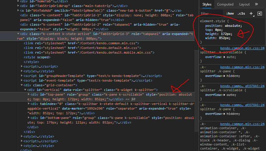 It looks like that Kendo is giving the div1 a default height that is constanly overwritten? (splitter2.png).