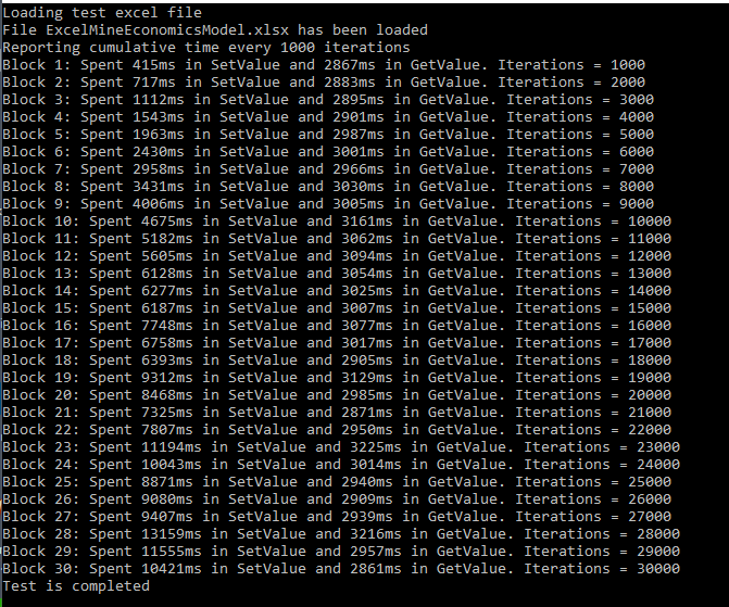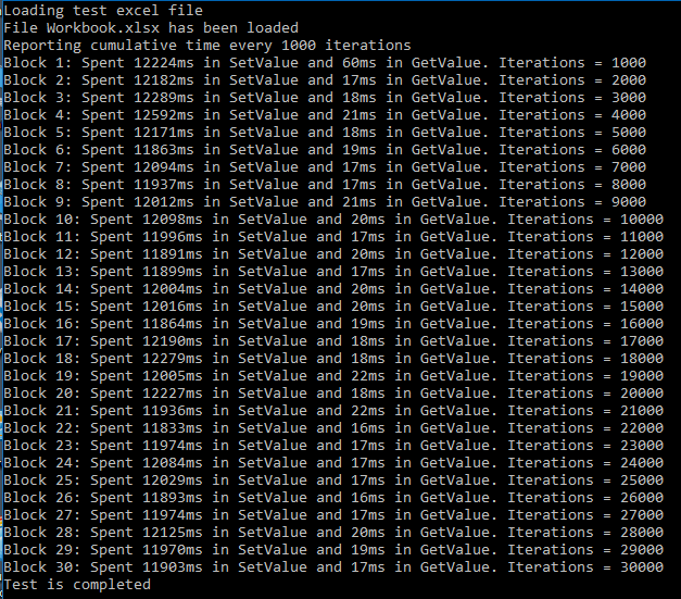 Hi Deyan, I've attached a simple console app that loads an xlsx file then then loops through, calling SetValue() and GetValue() in a loop. It accumulates the time spent in the SetValue and the GetValue calls, and reports those values every 100 iterations, before resetting the stopwatches.