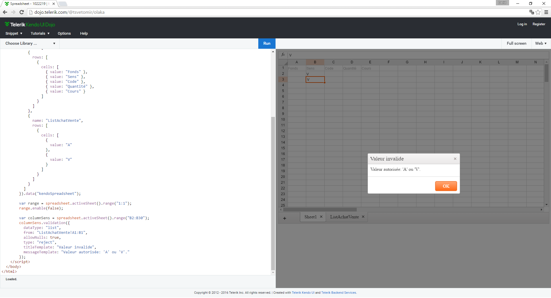 $(function () { var spreadsheet = $("#spreadsheet").kendoSpreadsheet({ toolbar: false, //sheetsbar: false, sheets: [ { rows: [ { cells: [ { value: "Fonds" }, { value: "Sens" }, { value: "Code" }, { value: "Quantité" }, { value: "Cours" } ] } ] }, { name: "ListAchatVente", rows: [ { cells: [ { value: "A" }, { value: "V" } ] } ] } ] }).data("kendoSpreadsheet"); var range = spreadsheet.activeSheet().range("1:1"); range.enable(false); var columnSens = spreadsheet.activeSheet().range("B2:B30"); columnSens.validation({ dataType: "list", from: "ListAchatVente!A1:B1", allowNulls: true, type: "reject", titleTemplate: "Valeur invalide", messageTemplate: "Valeur autorisée: 'A' ou 'V'." });});