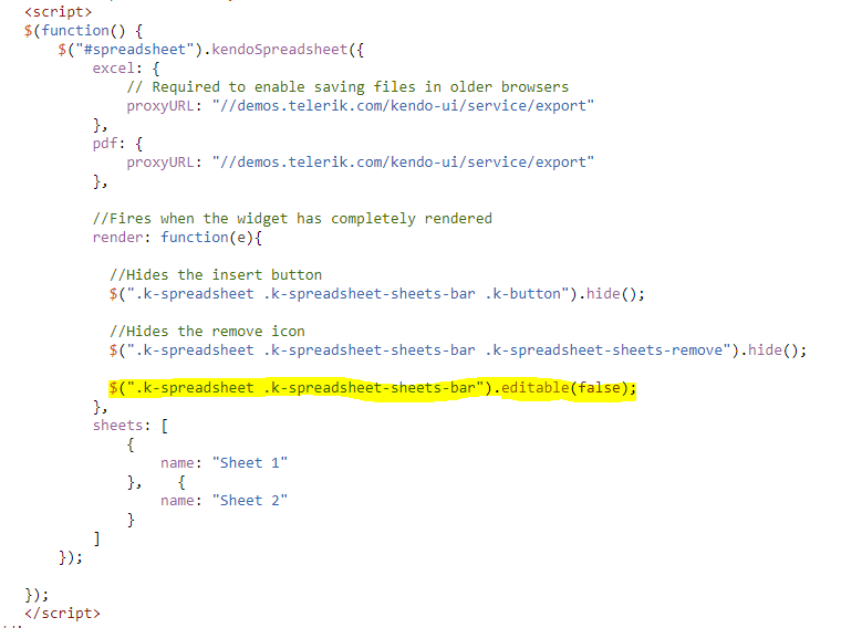 I am currently working with a Kend UI spreadsheet control, and was wondering if there was a way to disable ALL editing for the sheetsbar, or sheets tab: