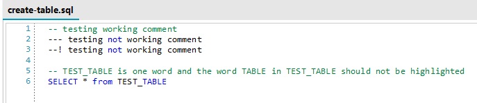 In other words, the word TEST_TABLE is one word and is NOT a keyword, but because TABLE is a keyword and it is wrapped with _ and a end of line, TABLE is highlighted.
